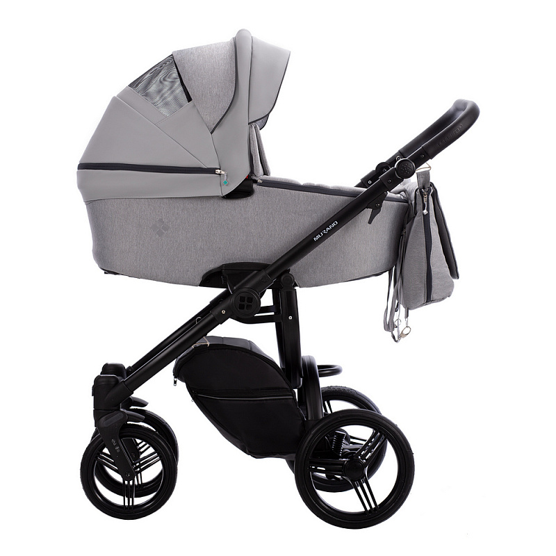 Bebetto Murano 3 в 1 – новая модель от Bebetto, сочетающая в себе тканевое и кожаное покрытие. Коляска выглядит привлекательно и при этом функциональная. Отличается тем, что капюшон выполнен из экокожи, а короб люльки, прогулочный модуль и автолюлька покрыты текстилем.