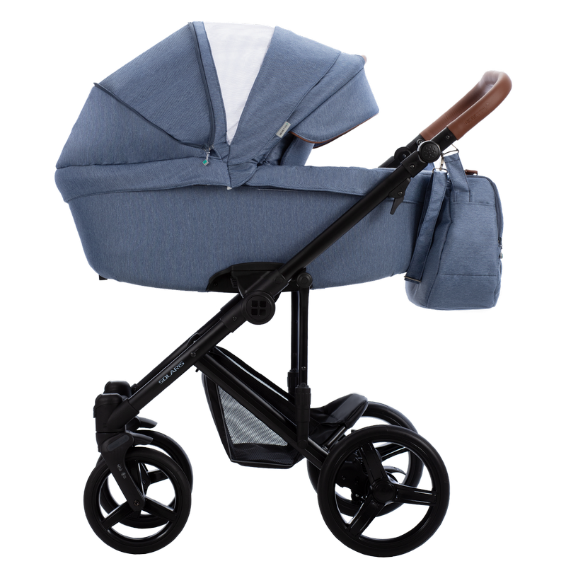Важная функция коляски Solaris 3 в 1 — амортизаторы на задних колесах, амортизация на раме с регулировкой жесткости и система поглощения колебаний, установленная на передних колесах. Дополнительный плюс — ветрозащитный отворот от ветра на накидке. Коляска также комплектуется сумкой для мамы с карманами.