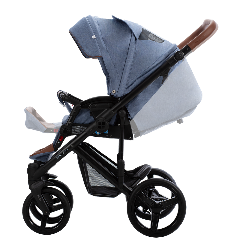 Рама в модели Solaris 3 в 1 алюминиевая. Цельная регулируемая ручка в месте хвата покрыта приятной на ощупь экокожей. Есть опция автоматической блокировки. Колеса полиуретановые, ненадувные. Передние колеса — с функцией свободного вращения, что пригодится на идеально ровной поверхности или для лавирования в ограниченном пространстве. Стоят системы поглощения колебаний (SAS) и памяти направления (DMS). Задние колеса дополнены пружинными амортизаторами и тормозной системой stop/go. Также амортизаторы с регулировкой по жесткости и мягкости установлены на раме. Корзина съемная, открытого типа.