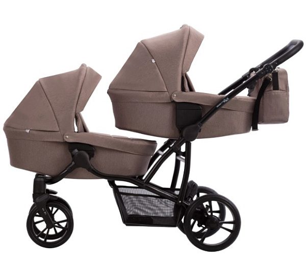 В комплект входят алюминиевая рама с четырьмя ненадувными колесами, две люльки с накидками, съемной хлопковой обивкой и матрасами, два прогулочных блока с накидками на ножки, пятиточечными ремнями и съемными бамперами, а также два комплекта адаптеров для регулировки высоты люлек. Дополнительно: сумка для мамы с креплением через плечо, две универсальные москитные сетки, два универсальных дождевика, подстаканник и открытая текстильная корзина для покупок. Эти аксессуары делают прогулки с двойняшками удобными и практичными в любых условиях.