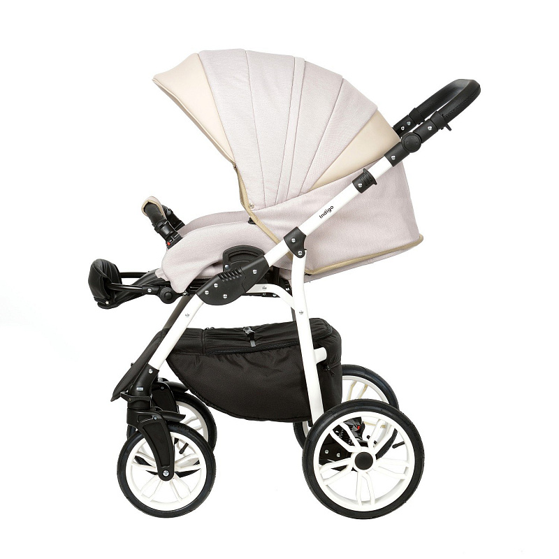 Рама облегченная, алюминиевая. Модули крепятся к ней с помощью системы One Touch Sistem, которая существенно упрощает задачу родителям. Амортизаторы в коляске Indigo пружинные, тормоз центральный — Stop&Go. Благодаря системе выдвижных осей эту модель можно свободно перевозить в багажнике автомобиля, не боясь ничего поцарапать. Багажная корзина текстильная, закрытого типа. Колеса резиновые, надувные, с поворотной опцией у передних.