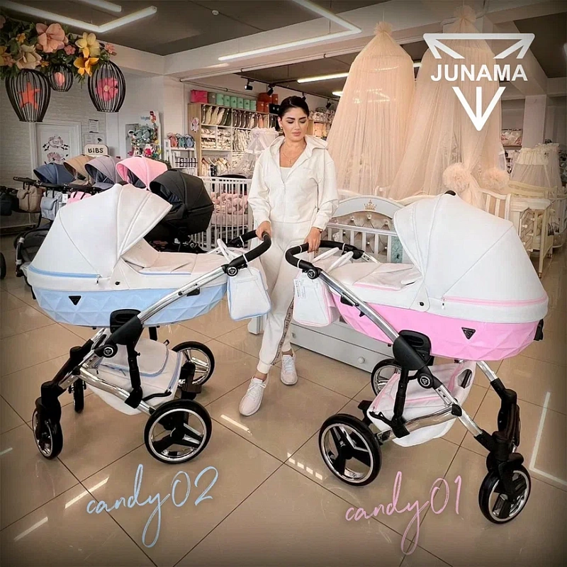 Junama Candy – обновленная версия коляски известного польского бренда, которая принадлежит «нежной серии» моделей. Для мам и пап, которые желают купить стильную коляску с коробом люльки, напоминающим бриллиант, но в нежных тонах. Модель представлена в двух типовых расцветках для прогулок с мальчиками (голубой) и девочками (розовый). Элегантности коляске добавляет хромированная рама, которая только подчеркивает нежность и спокойствие.