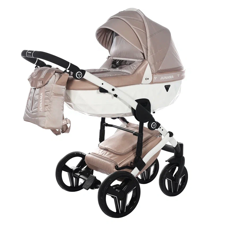 Коляска Junama Clermont 3 в 1 на белой раме — это не только шасси и три сменных блока, но и стильная сумка для мамы с пеленальным матрасиком, дождевик, москитная сетка, подстаканник.
