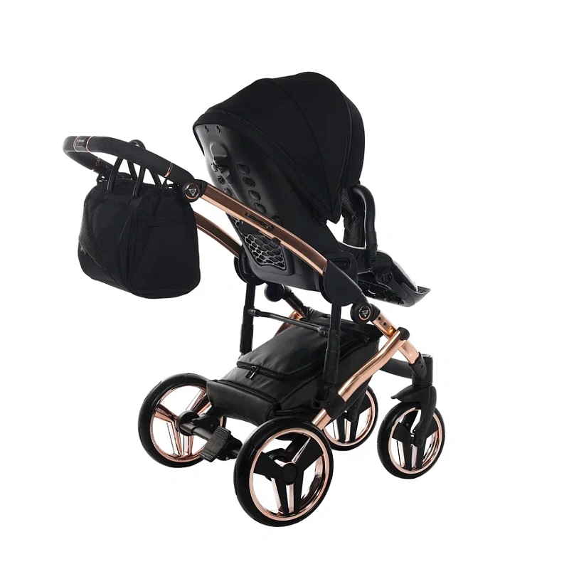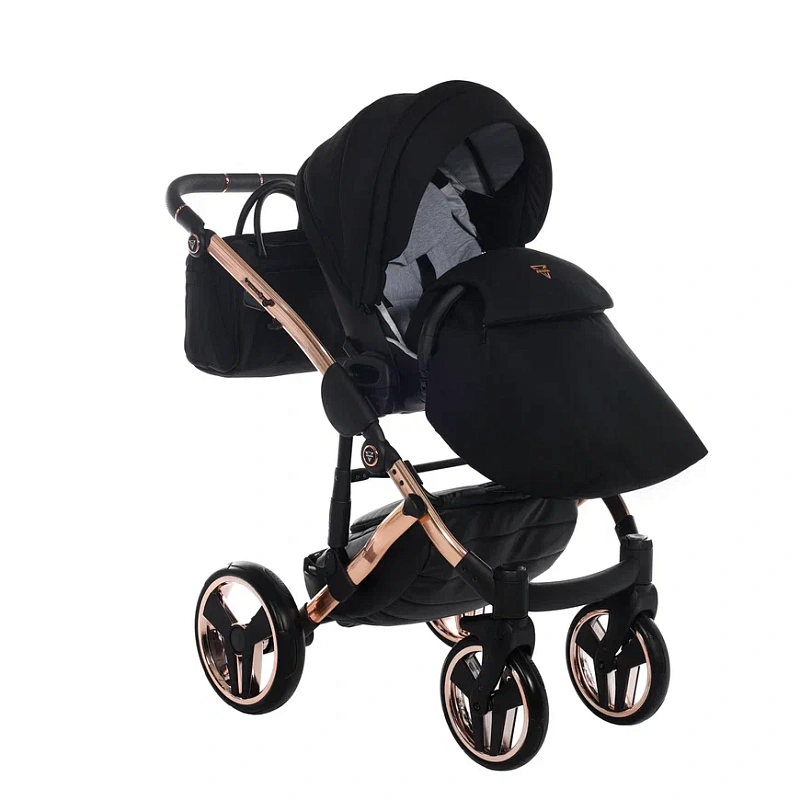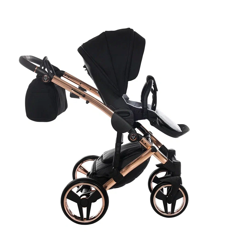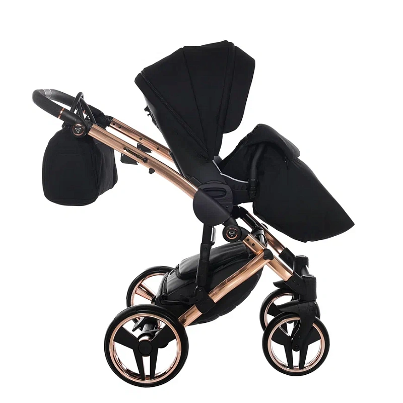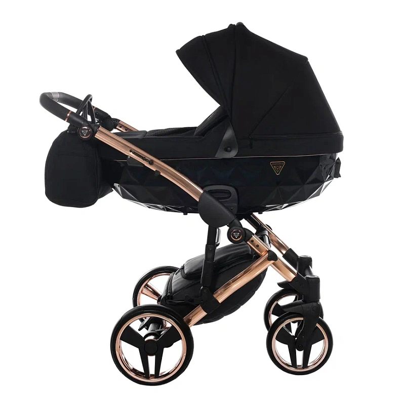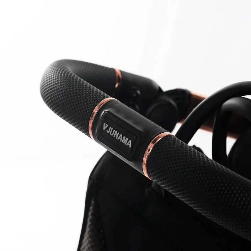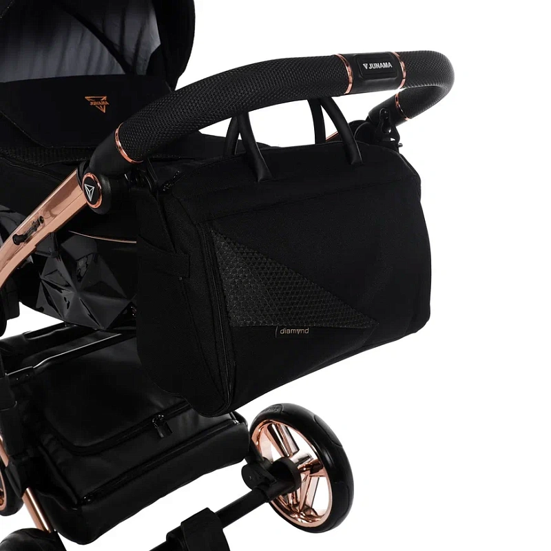 Коляска Junama Diamond Individual V2 3 в 1 на медной раме укомплектована чехлом на ножки, сумкой на ручку, держателем для бутылочки, дождевиком и москитной сеткой.
