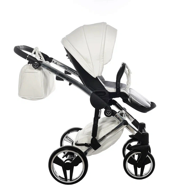 Junama Diamond Individual V2 3 в 1 — модульная коляска, которая отличается дизайном люльки в виде драгоценного камня, а также черными и белыми блоками. Цвет рамы меняется в зависимости от модификации: в данной она серебряная. Обновленная Version 2 получила несколько функциональных дополнений. В остальном это по-прежнему уникальная и функциональная коляска для прогулок по городу с ребенком с рождения до 3-4 лет.