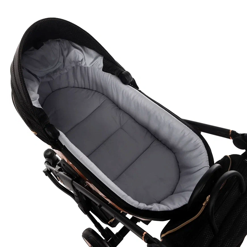 Люлька модели выделяется не только внешним видом, но и функционалом. Рама легкая, выполнена в ряде цветов. В этой модификации она черная, нейтральная. Капюшон надежный, есть ветрозащитный отворот и теплая накидка на ножки. Для летних прогулок предусмотрена система вентиляции, чтобы ребенку не было жарко. Подголовник регулируется, малыша можно присаживать перед переходом в прогулочную коляску.