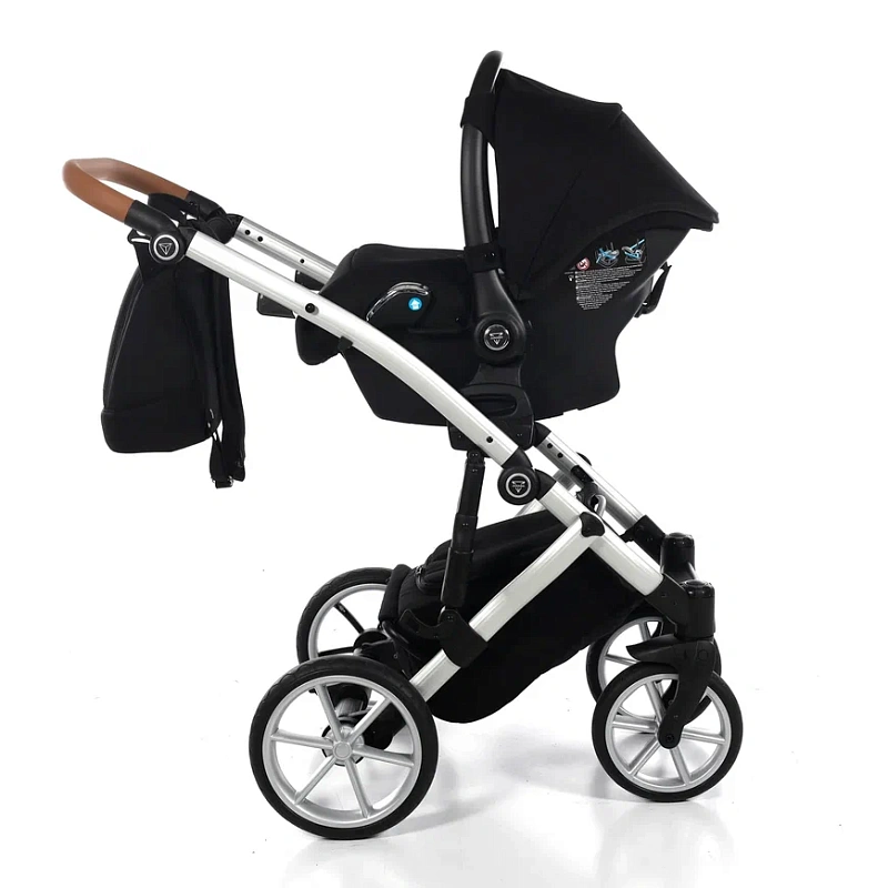 Рама алюминиевая — легкая, прочная, с элегантным покрытием белого цвета. Колеса в Junama гелевые, не нуждаются в подкачивании и не боятся проколов. Передние колеса для лучшей маневренности оснащены поворотной функцией. Система амортизации состоит из трех пар подвесок с регулировкой жесткости. Вместе с противоударной системой «антишок» они дают плавный и тихий ход коляске. На задних колесах установлен центральный тормоз. Корзина закрытая, компактная. Ручка имеет регулировку по высоте, покрыта искусственной кожей, за которую приятно держаться.
