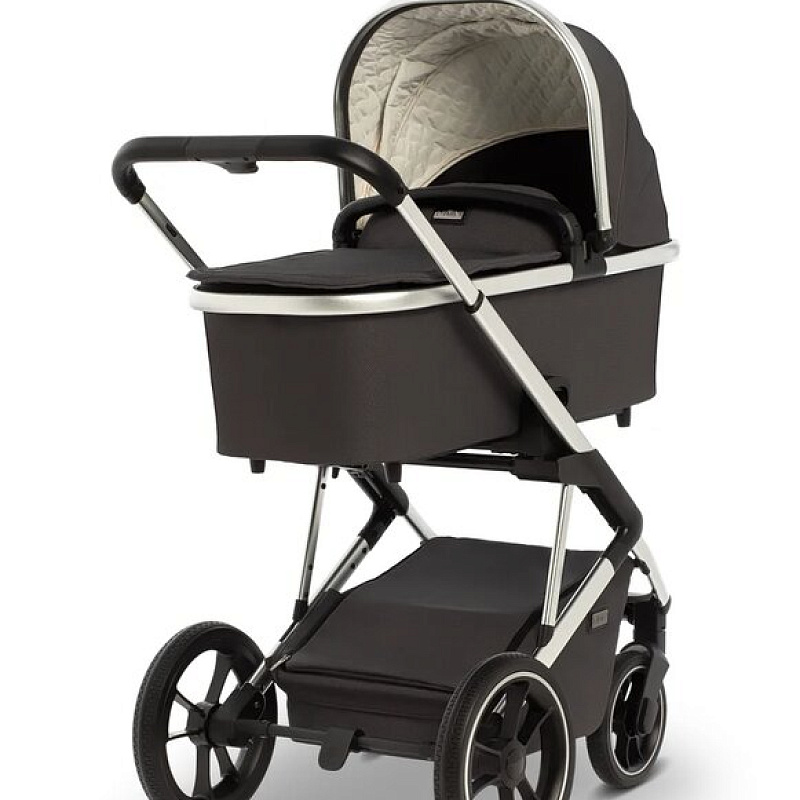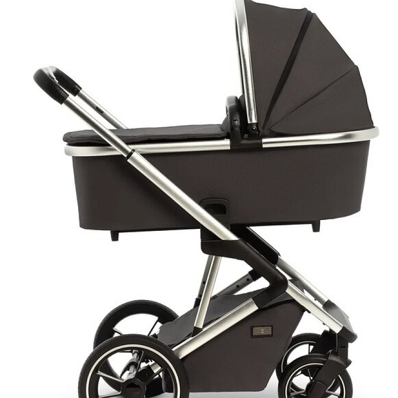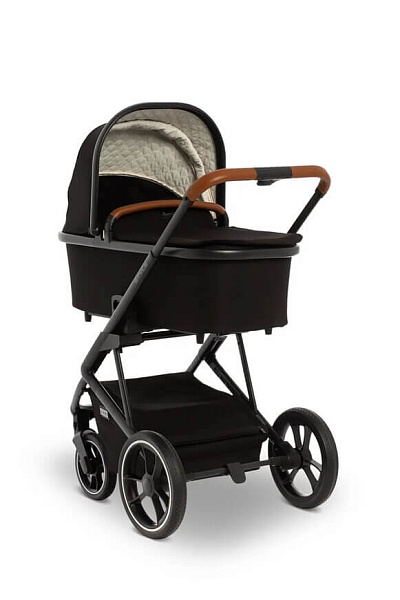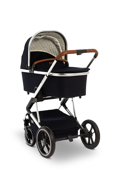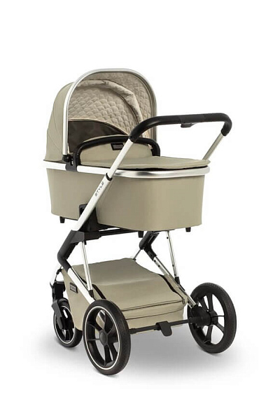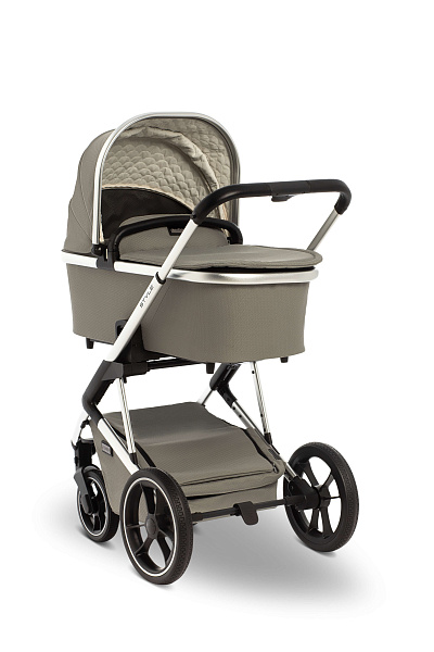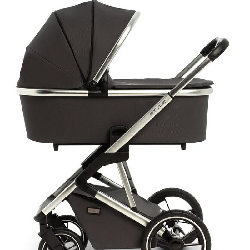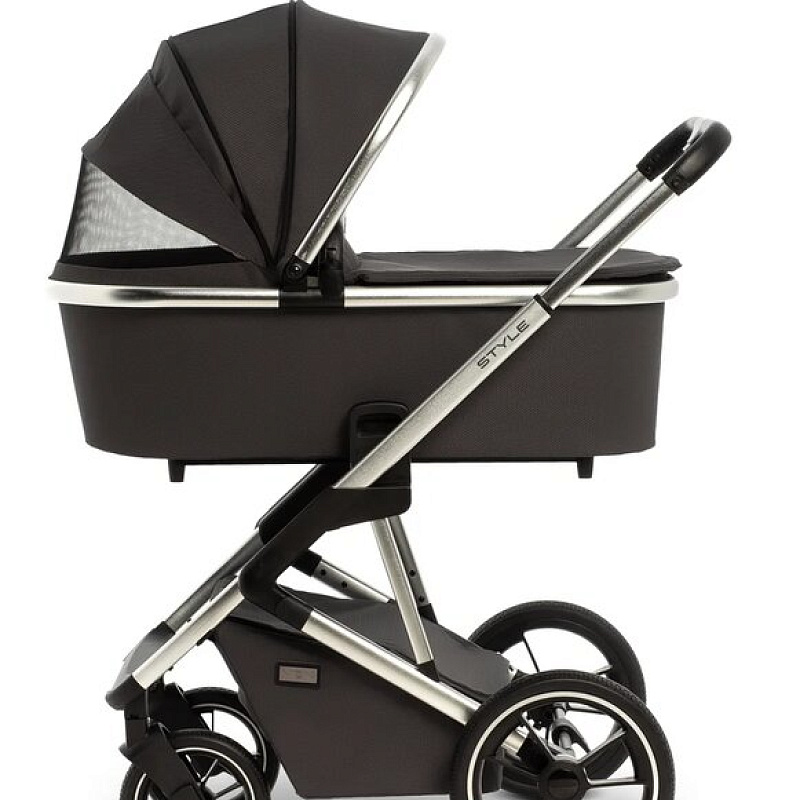 Шасси коляски Moon Style 2 в 1 узкое, всего 56 см. По этой причине коляска спокойно входит даже в узкие лифты. Колеса большие, с амортизаторами, высокой устойчивости. По традиции для колясок немецкого производства колеса сделаны из того же материала, что и автомобильные шины. Передние колеса могут ходить свободно, фиксируются вовнутрь и наружу. Шасси можно сложить вместе с прогулочным сиденьем, установленным в положении по ходу движения.