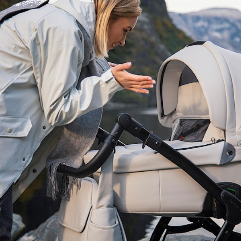 Коляска «Фьорди», выпущенная в 2021 году, дополнена сумкой-рюкзаком, дождевиком, москитной сеткой, подстаканником.