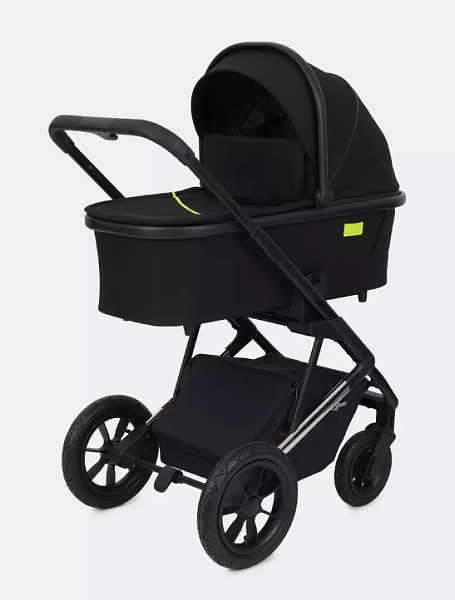 Сменные модули устанавливаются на шасси с помощью системы One Click Move. Блоки покрыты качественной тканью с защитой от влаги и солнца. В коляске Axiom надувные колеса, которые с легкостью преодолевают любые дорожные препятствия. Амортизаторы стоят на всех колесах. Передние колеса свободно вращаются и фиксируются для строго прямого движения.