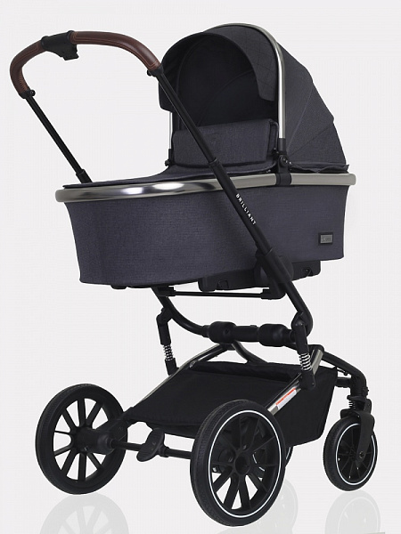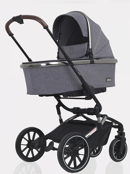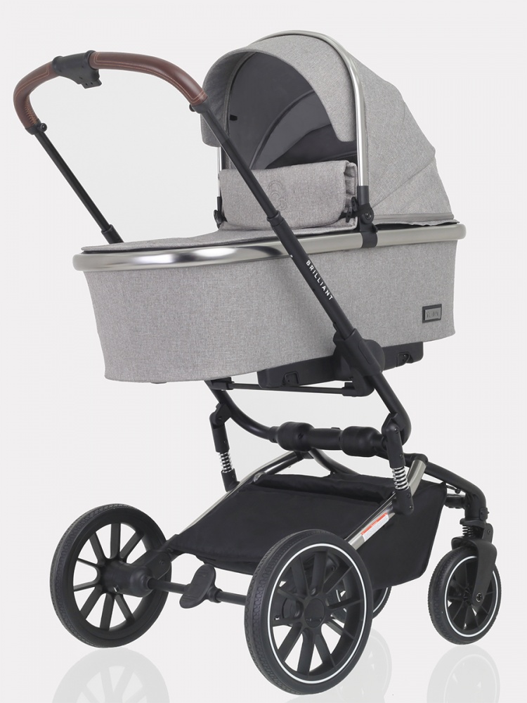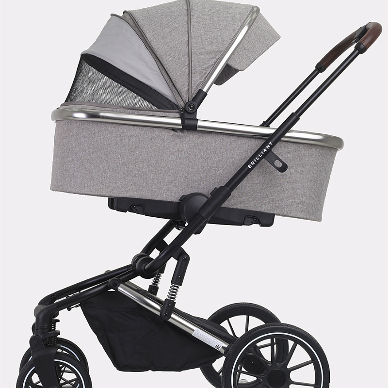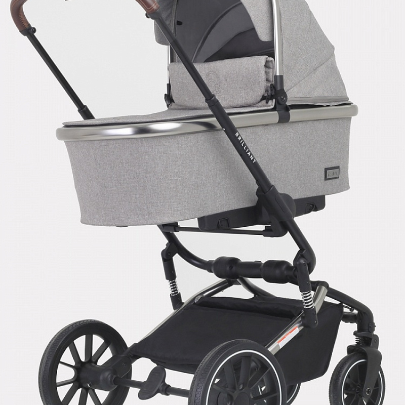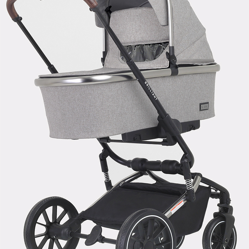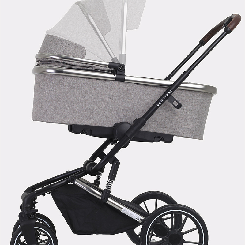 Другое важное преимущество коляски «Бриллиант» — наличие целых шести амортизаторов в разных точках шасси. Благодаря этому коляска обладает замечательным плавным ходом. Установка и снятие блоков осуществляются одним движением с помощью системы One Click. Ручка управления телескопическая, регулируется по высоте и подстраивается под рост взрослого. Багажная корзина вместительная, оба капюшона объемные, с защитными козырьками и скрытыми секциями, делающими их еще больше. Снаружи модель покрыта премиальной тканью с надежной пропиткой, защищающей от дождя и ветра.