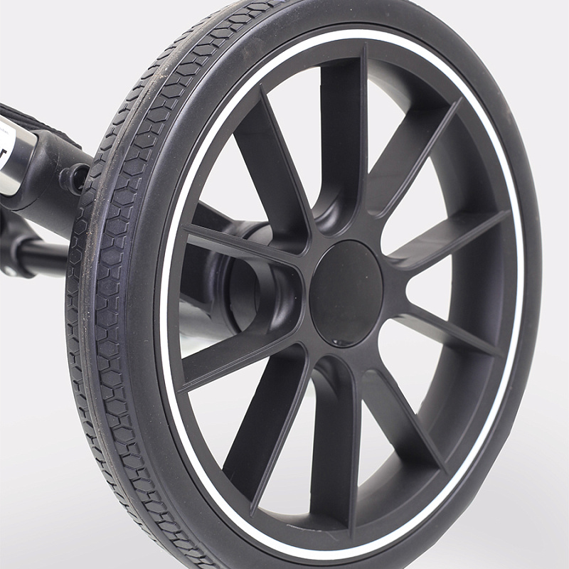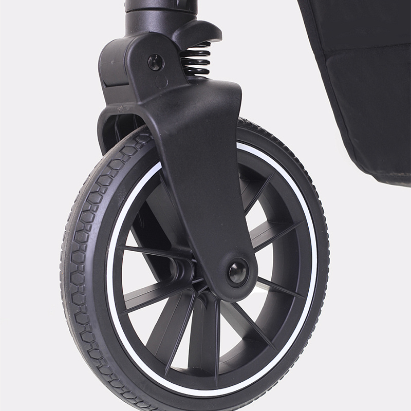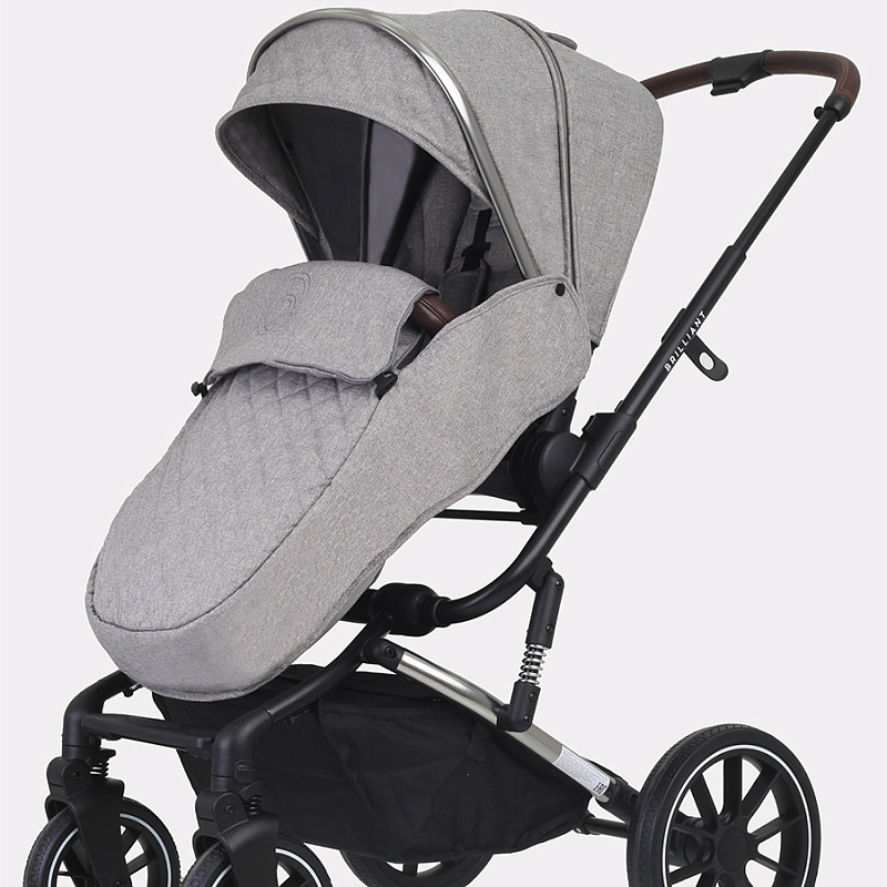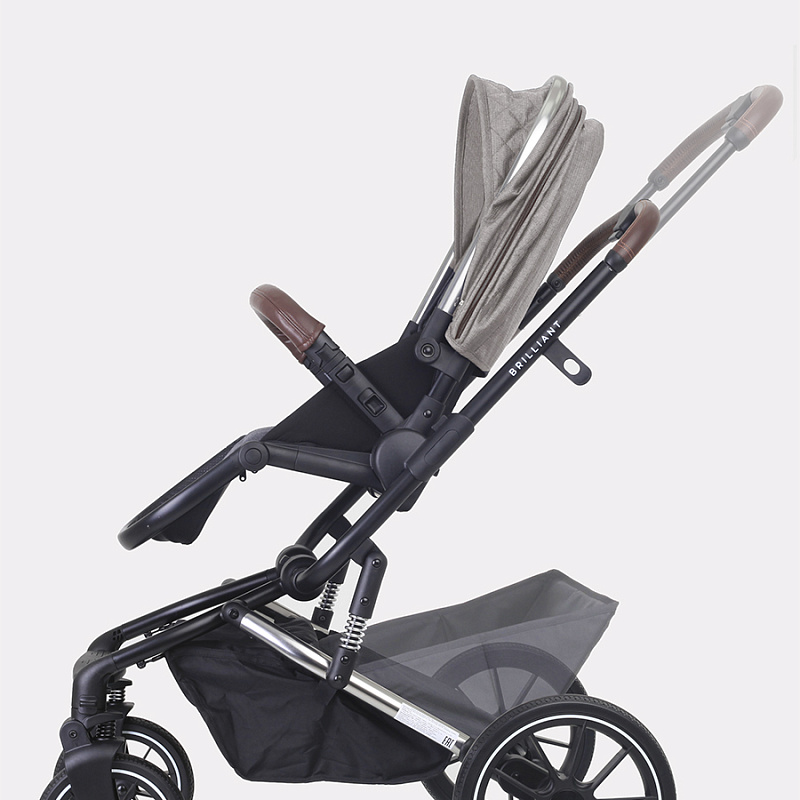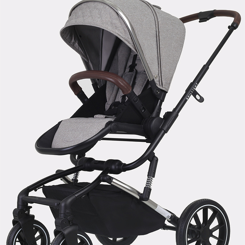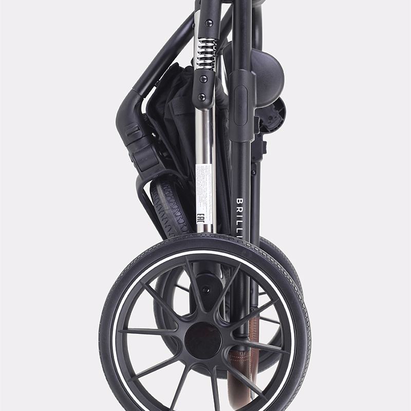 У коляски Brilliant резиновые колеса из полиуретана. Это практичный материал, не боящийся проколов и не нуждающийся в подкачивании. Вместе с амортизационной системой создает идеальные условия для ребенка. Передние колеса могут вращаться на 360 градусов, добавляя коляске маневренности. Складывается рама из алюминия «книжкой», есть ножной тормоз в виде не пачкающей обувь педальки.