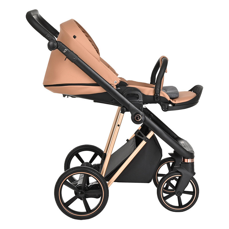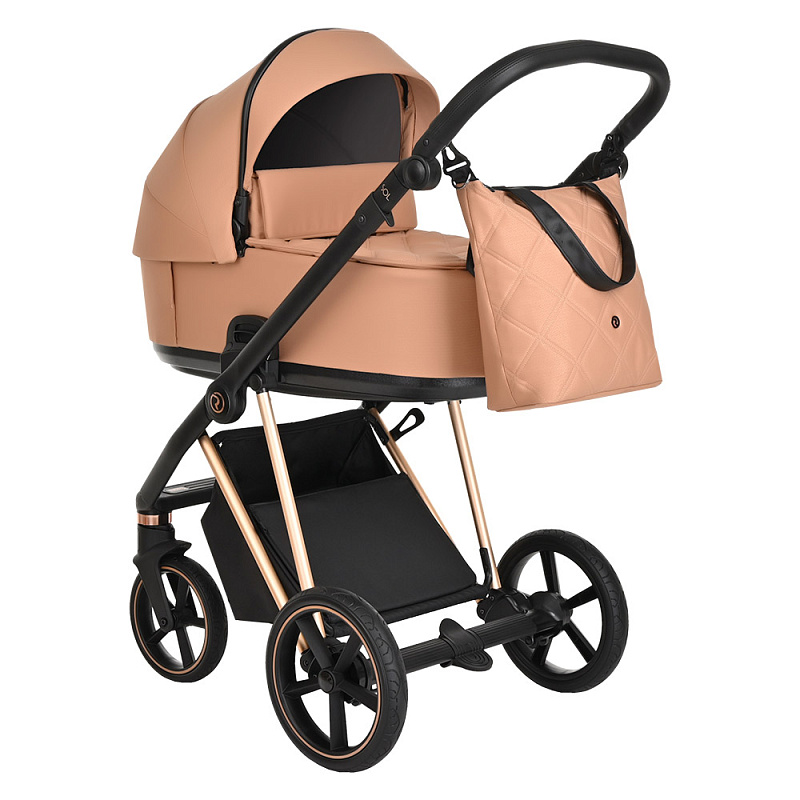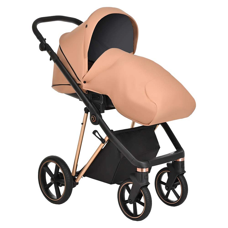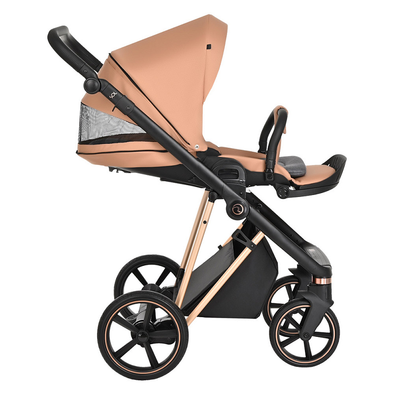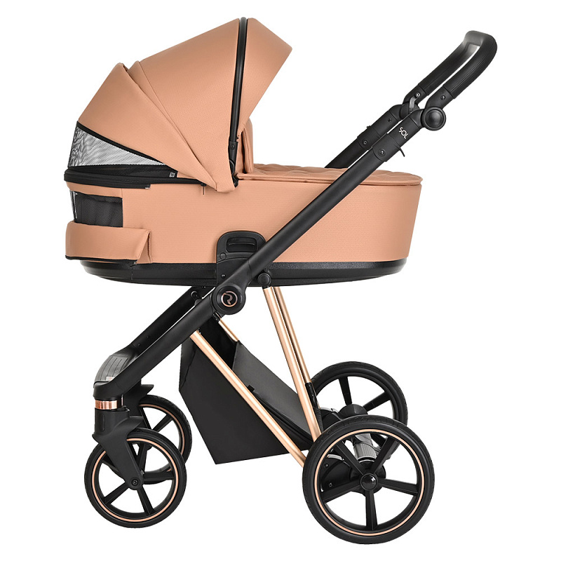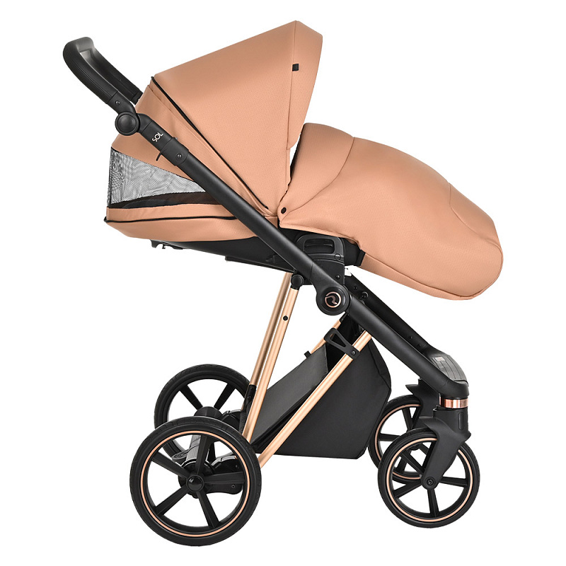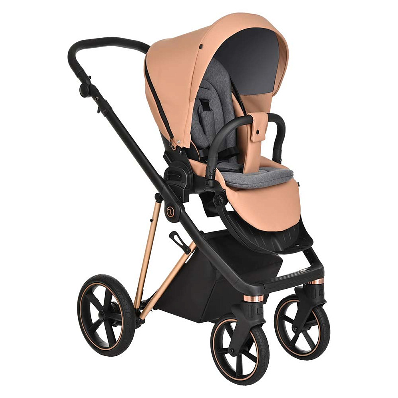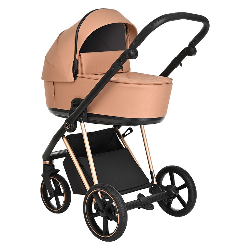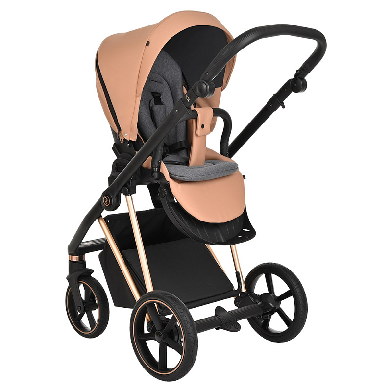 Колеса ненадувные: внутри специальный гель. Это колеса не пробивается и не сдувается, при этом обеспечивает коляске мягкий ход. В каждом колесе есть двойной подшипник, чтобы коляска двигалась беззвучно. В основании рама – стильная корзина.