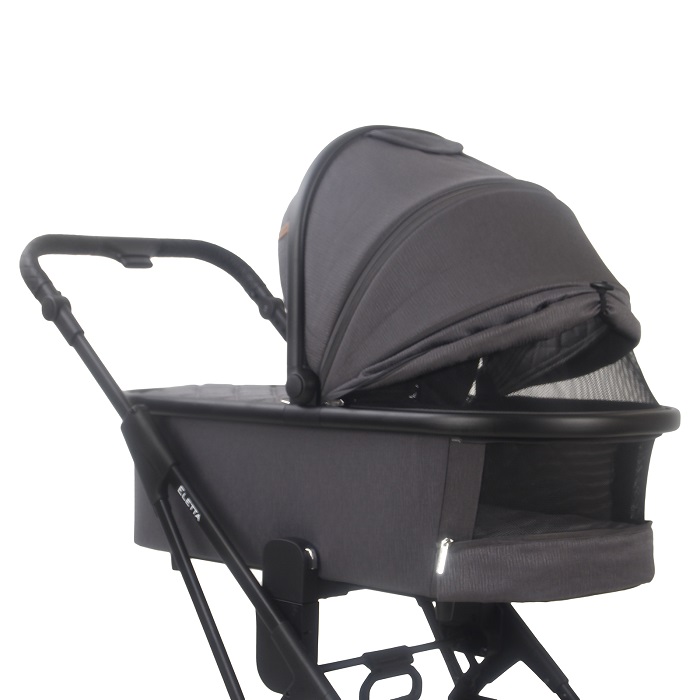 Летом коляску можно максимально открыть, чтобы обеспечить качественную вентиляцию. Окошки для проветривания есть в самой люльке и в капюшоне, также внутри люлька отделана натуральной тканью с “дышащим” эффектом. В целом спальный блок вместительный, в нем поместится ребенок в объемном конверте или одеяле. Люльку просто установить на раму при помощи адаптеров. Блок реверсивный, его можно установить не только в положение “к себе”, но и “от себя”.