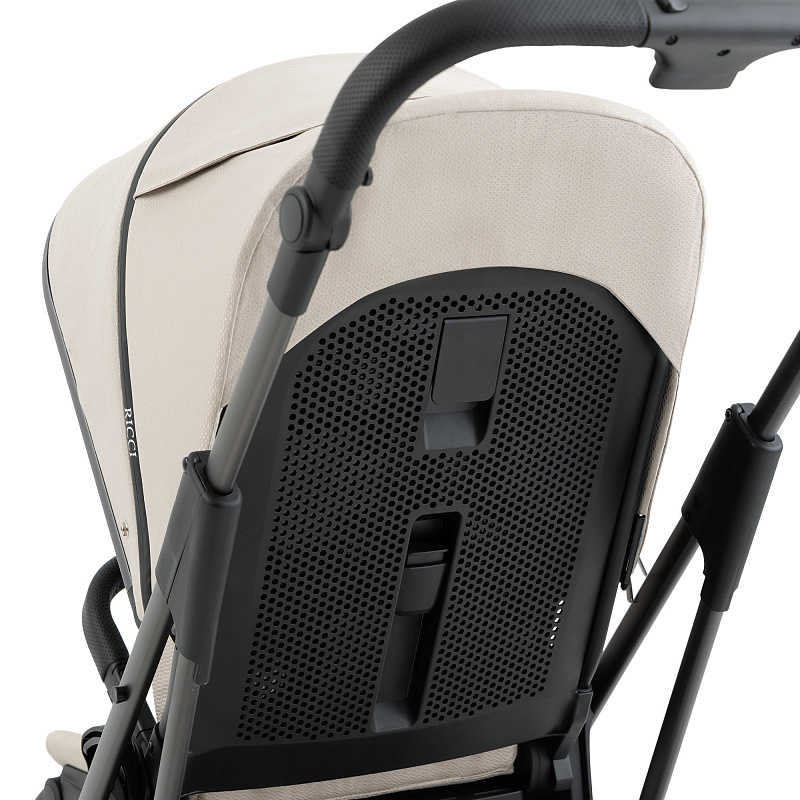 У модели Ricci большой и просторный спальный модуль. На дне люльки приделаны ножки, чтобы можно было превращать спальный блок для коляски в колыбель. Люлька комплектуется матрасиком с непромокаемым чехлом. Регулировка капюшона бесшумная: это важно, чтобы регулировать капюшон и не будить малыша. Спальный блок легко отсоединяется и присоединяется к каркасу при помощи системы Memory Button. Накидка на ножки целиком закрывает кроху, поэтому ребенку будет комфортно гулять даже в ветренную погоду. Если на улице жарко, оборудовано сразу две вентиляционных системы: на капюшоне и на дне люльки..