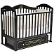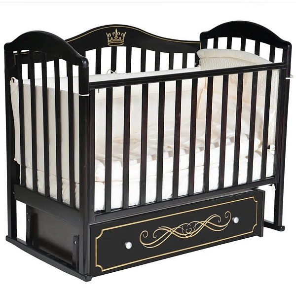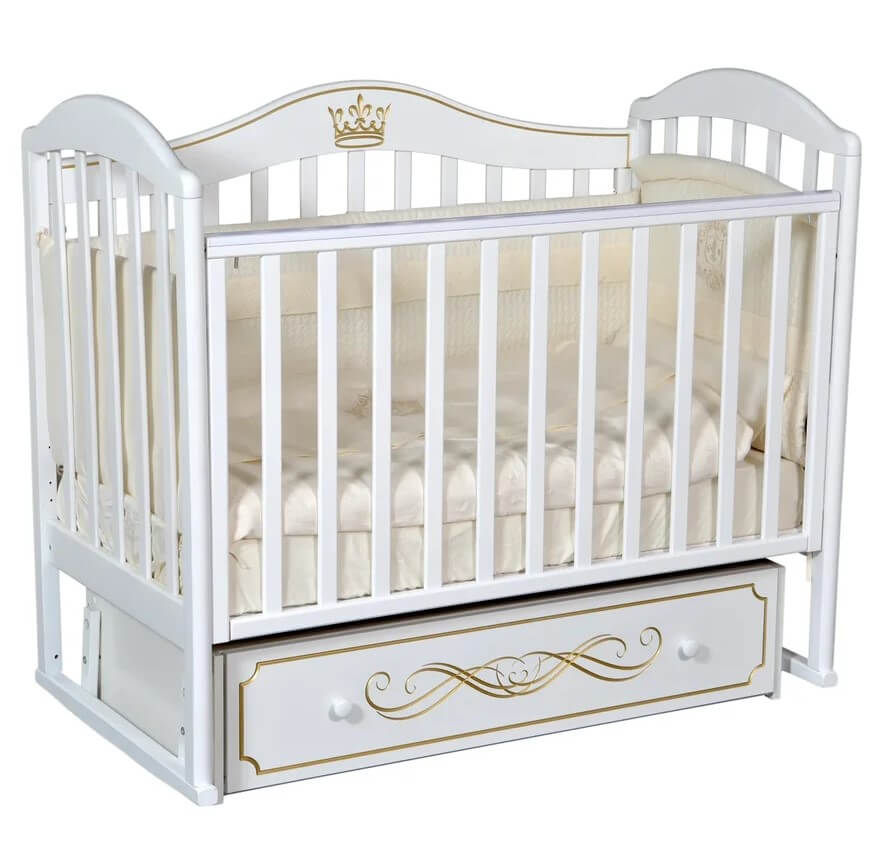 Маятник дает возможность качать ребенка в двух направлениях, а также фиксировать в статичном положении. Боковины регулируются, передняя боковая часть при необходимости снимается. На боковушках надеты обязательные для детской мебели накладки из силикона для детских зубов. Место для сна — 120x60 см. За счет ящик для игрушек и постельных принадлежностей кроватка весит 34 кг.