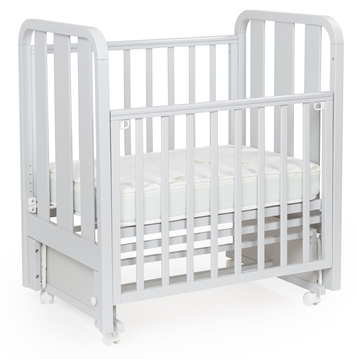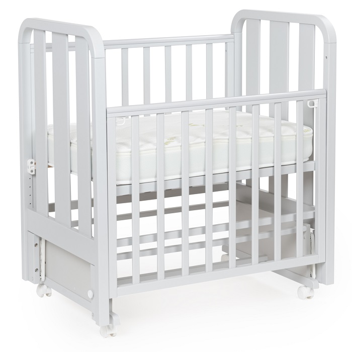 Кроватка совместима с матрасиком размером 90x60 см. Толщина матрасика – 12 см. На боковинах есть накладки из силикона. Мебель произведена в России.