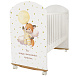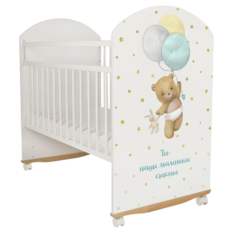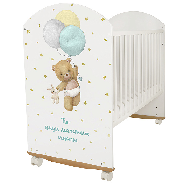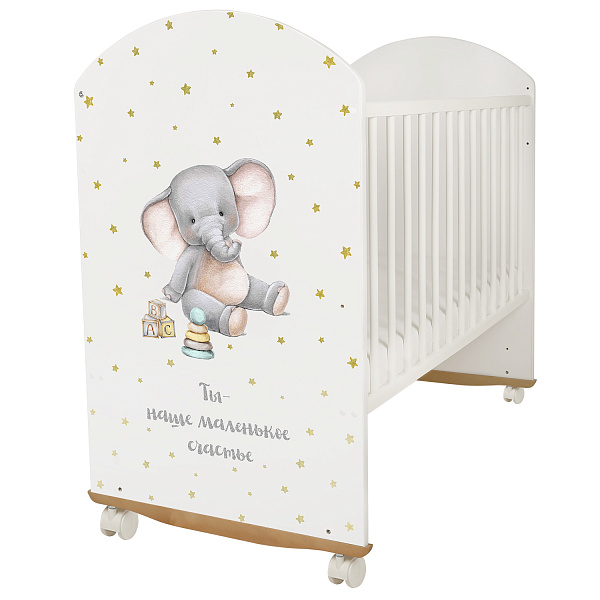 У этой модели фигурная спинка. Колеса идут в комплекте. Прутья размещены на безопасном расстоянии для ребенка. Передняя стенка регулируется по высоте. Боковые части кроватки украшены изображением сказочных животных — медвежонка, лисенка и слоненка.