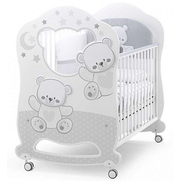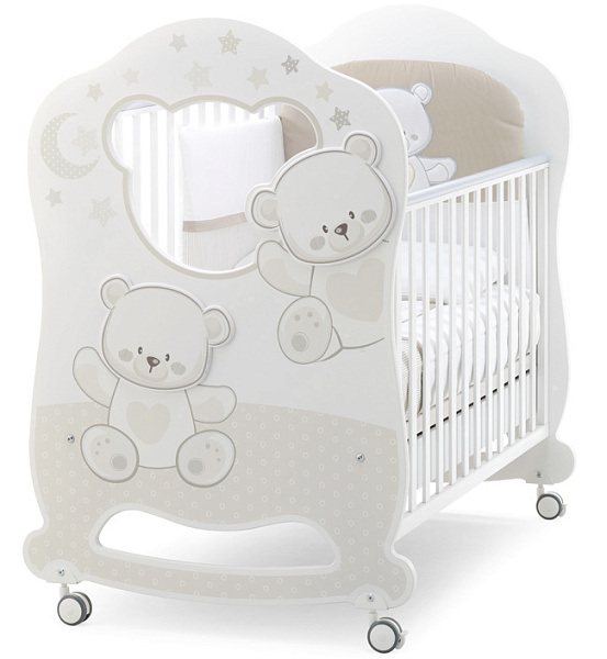 Модель Jolie Oblo оснащена качалкой и колесиками. Выбор позволяет родителям выбирать нужный функционал при сборке и во время использования. При производстве кроваток итальянского бренда применяются не вызывающие аллергии краски на водной основе. Кровать безопасная: расстояние между рейками боковых стенок 4-7 см, поэтому ручки, ножки и голова никак не смогут застрять между ними. Расстояние между краями и ортопедической сеткой 2,5 см, что также исключает потенциальную травму ребенка. Ортопедическая сетка выполнена из бука, гарантирует ребенку правильную осанку. Матрас не входит в комплект и продается отдельно.