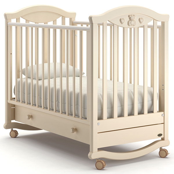 Маневренные колесики поворачиваются на 360 градусов и обеспечивают удобное передвижение изделия по помещению. Ящик плавно открывается с помощью пары круглых ручек и вмещает многочисленные детские вещи. Полозья плавно раскачивают кроватку и помогают маме уложить ребенка спать.