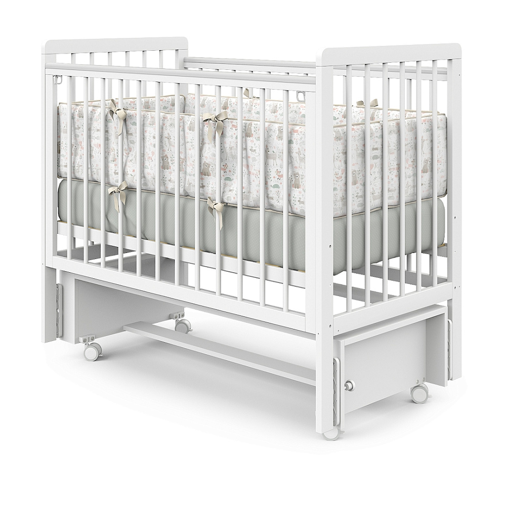 Кроватка оснащена продольным маятниковым механизмом, который создаёт мягкое укачивание, помогая малышу быстрее засыпать. При необходимости маятник легко фиксируется. Спальное ложе регулируется по высоте в трёх положениях, адаптируясь под возраст ребёнка. Передняя стенка с функцией автоспуска быстро снимается, обеспечивая удобный доступ к младенцу.