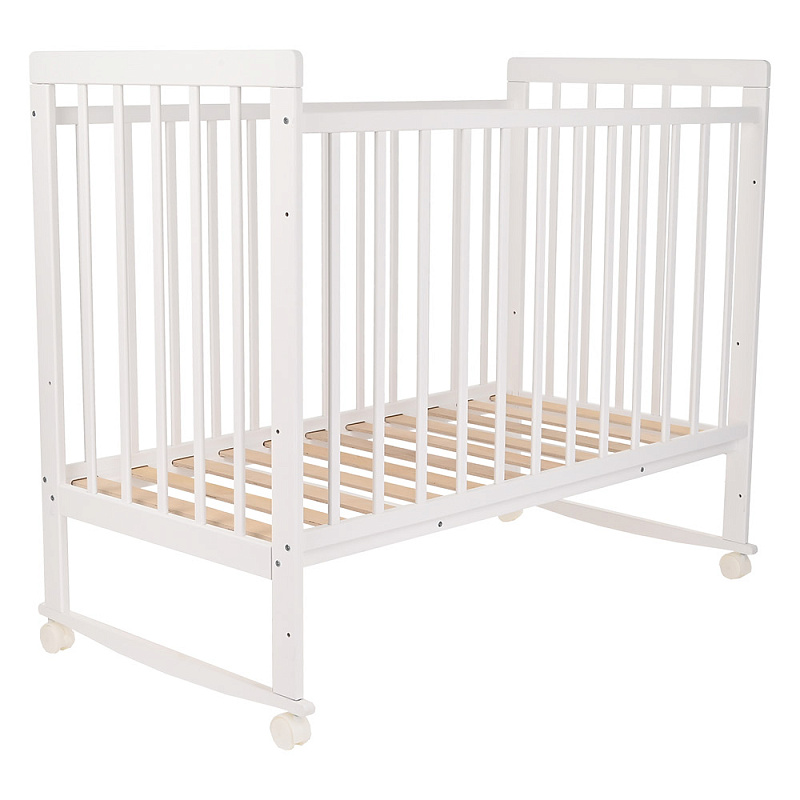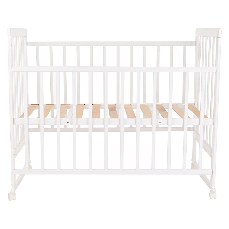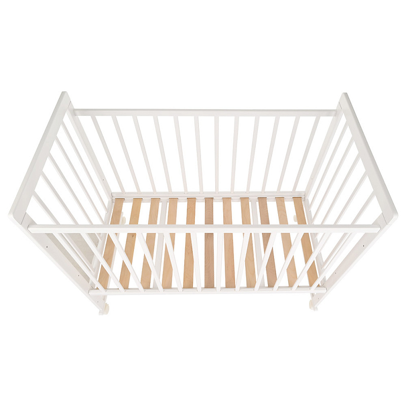Кроватка снабжена колесиками со стопорами, чтобы можно было зафиксировать предмет мебели в любом месте комнаты. Передняя стенка фиксируется в верхнем и нижнем положениях, что удобно для мамы, когда она кладет и берет на руки ребенка. Обратите внимание, что в этой кроватке переднее ограждение полностью не снимается.