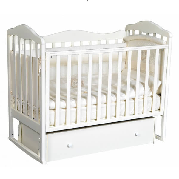 Дно модели Erika 4 выполнено из реек с ортопедическим эффектом. Спальное ложе имеет два положения по высоте. Для безопасности зубов и десен ребенка предусмотрены силиконовые накладки. Колес эта кроватка не имеет, постельное белье и матрасик в комплект не входят. В нижней части располагается вместительный функциональный ящик для детских вещей.