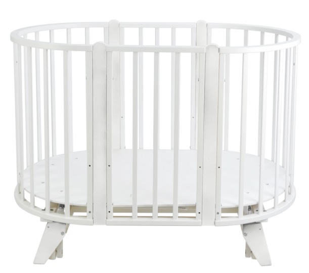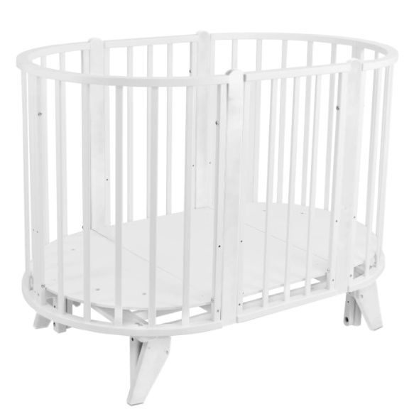Мебель под брендом Indigo сделана в РФ из массива березы. Трансформируется из круглой колыбели для новорожденного в овальную кроватку. Колесиков нет в наличии, однако изделие оснащено универсальным маятником. Вы можете установить поперечное или продольное укачивание на свой вкус. Дно регулируется в двух положениях.