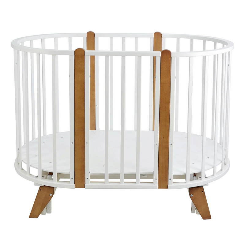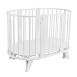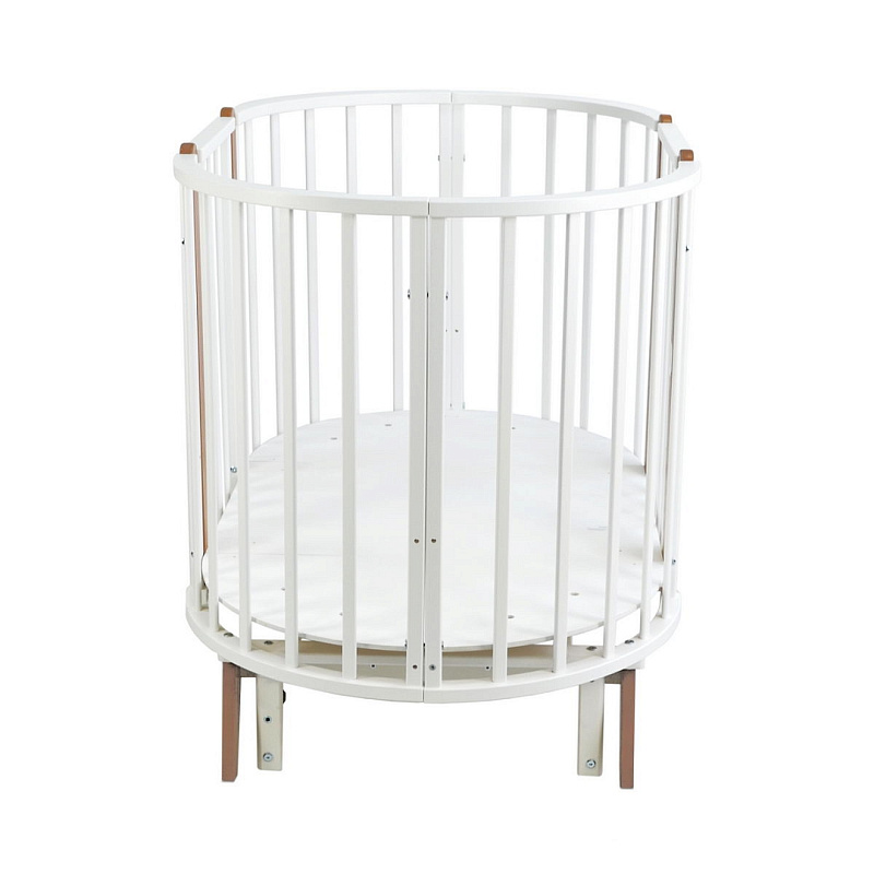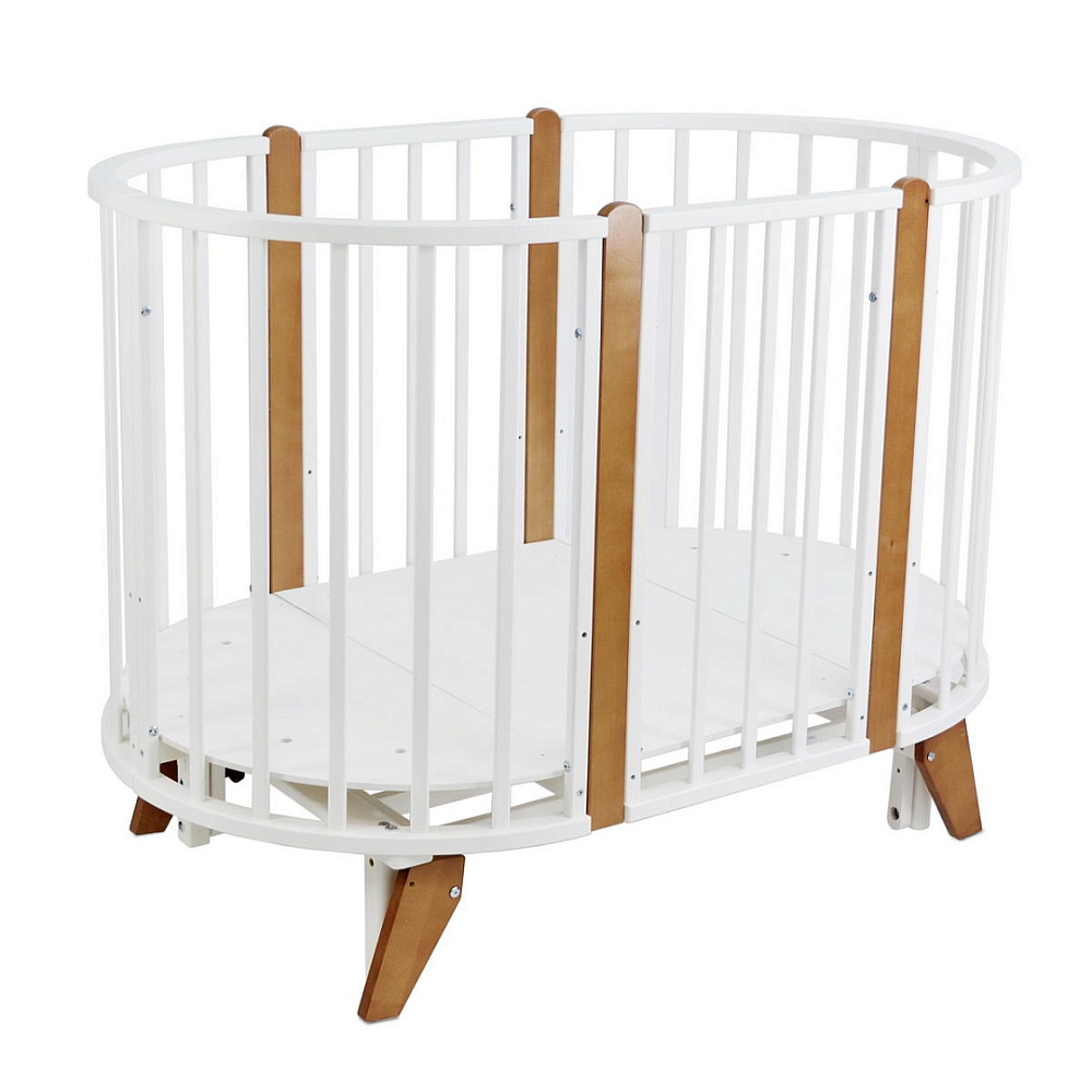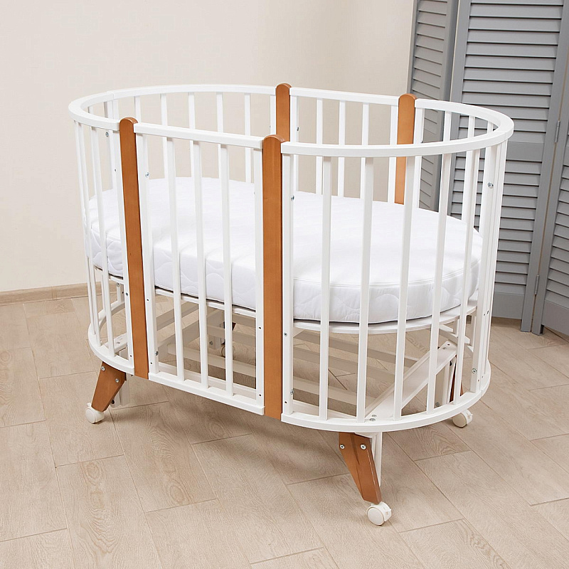 Кроватка трансформируется в круглую кровать и круглую кровать на маятнике, овальную кровать, овальную кровать на стойках или колесах, стол и два стула. Также в комплекте, помимо маятниковых механизмов поперечного и продольного укачивания, есть колеса со стопором.