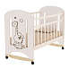 Спальное место состоит из реек. Реечный каркас сделан из натуральной древесины. Кроватка окрашена безопасным нетоксичным лаком. Уровней высоты два. Полозья у качалки имеют прямой упор на концах, что предотвращает опрокидывание конструкции. Боковые спинки оснащены обтекаемыми линиями. Есть откидная планка, облегчающая жизнь маме. Накладки ПВХ в комплект не входят.