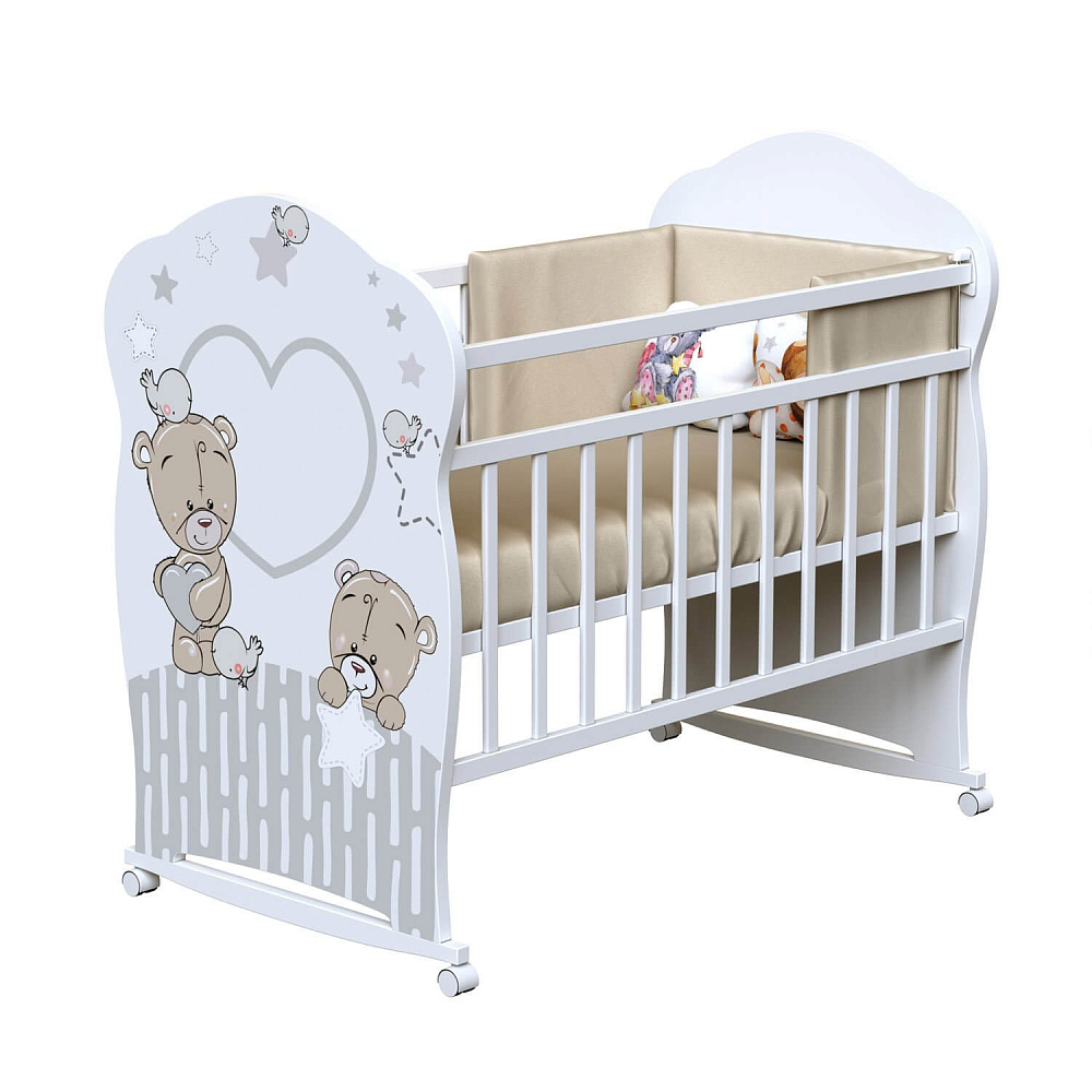Кроватка сделана из березы и ЛДСП. Среди функций — колеса и качалка. Также есть откидная планка, в комплекте идут силиконовые накладки-грызунки. В модели два уровня ложа, спальное место имеет стандартные размеры.