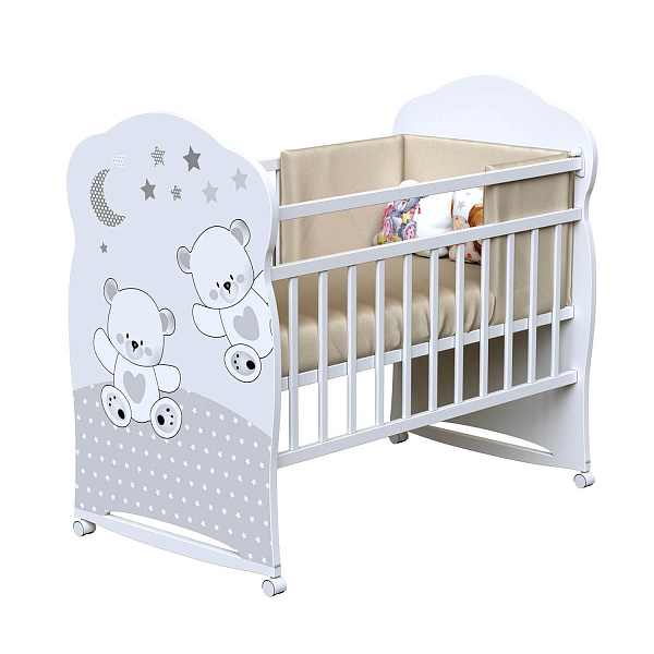 Мобильная детская кровать от российского бренда ВДК. Изготовлена из березы и ЛДСП, покрыта экологичной краской. Несколько нейтральных расцветок дают родителям выбор и позволяют гармонично вписать кроватки в интерьер любой детской комнаты. На боковине изображены милые медвежата с сердечками на животиках.