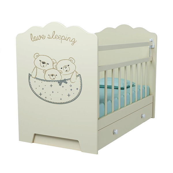 Кровать детская Love Sleeping от российского бренда ВДК — это мебель с поперечным маятником, выполненная из чистой древесины (березы), ЛДСП и окрашенная нетоксичным лаком на полимерной основе. Главное функциональное преимущество кроватки — маятник, главный эстетический плюс — рисунок на спинке, где трое медвежат ложатся спать.
