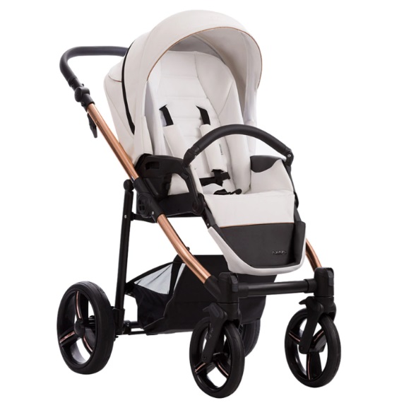 Дополнительную выразительность придает изысканный дизайн рамы и дисков колес, оформленных в оттенках благородных металлов. Важным преимуществом является возможность плавной регулировки наклона спинки в пяти различных положениях. Прогулочный блок реверсивный: его можно установить как лицом к родителю, так и по ходу движения, а механизм сложения коляски работает вне зависимости от того, в каком направлении закреплен блок, что делает использование особенно удобным.