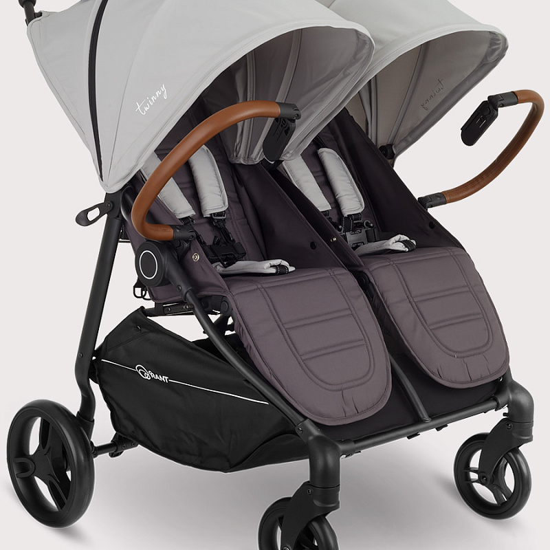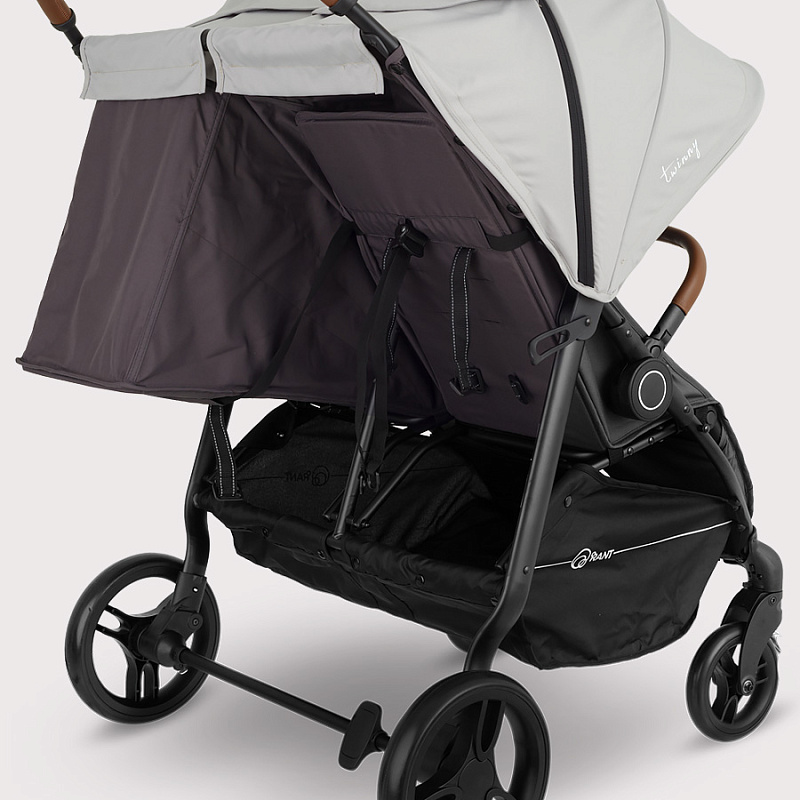 Откинув спинку, мама может оборудовать в каждой из колясок спальное место. Подножки регулируются, на время сна приподнимаются и увеличивают длину места для отдыха. Вторые подножки в каждой части понадобятя подросшим малышам. Спинки колясок регулируются с помощью ремешков, а это значит, что мама может выбрать любое положение спинки под совершенно разными углами. Чехлы в колясках «Твинни» сделаны из отталкивающей влагу, «дышащей», но при этом непродуваемой ткани.