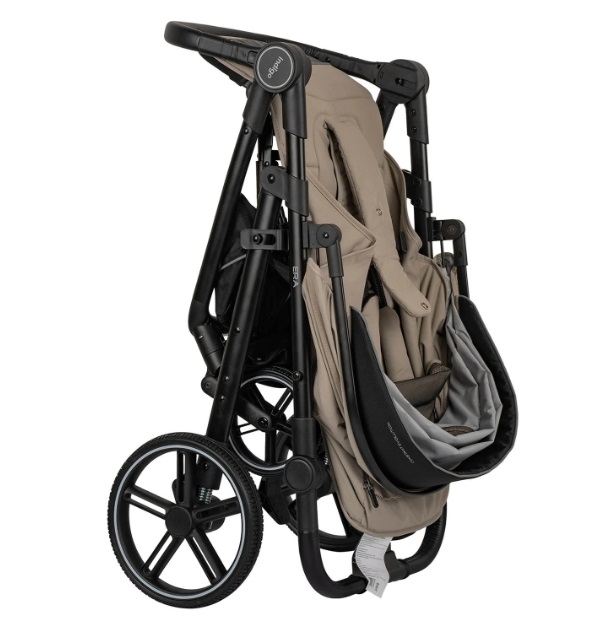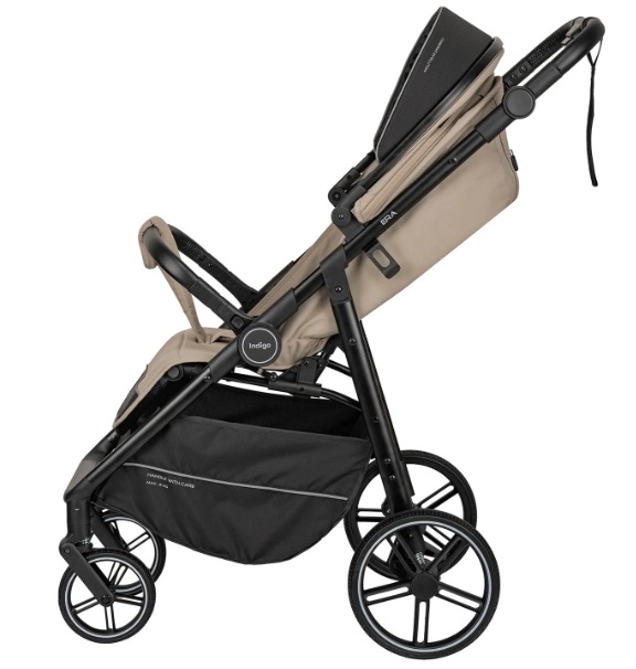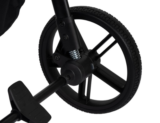 Коляска Era оборудована удобным механизмом сложения одной рукой. В сложенном виде коляска ставится а фиксатор, что удобно при транспортировке и хранении. Большая текстильная багажная корзина выдерживает нагрузку до 2 кг. Колеса из вспененного полиуретана оборудованы амортизаторами, передние свободно вращаются и фиксируются для прямого движения.