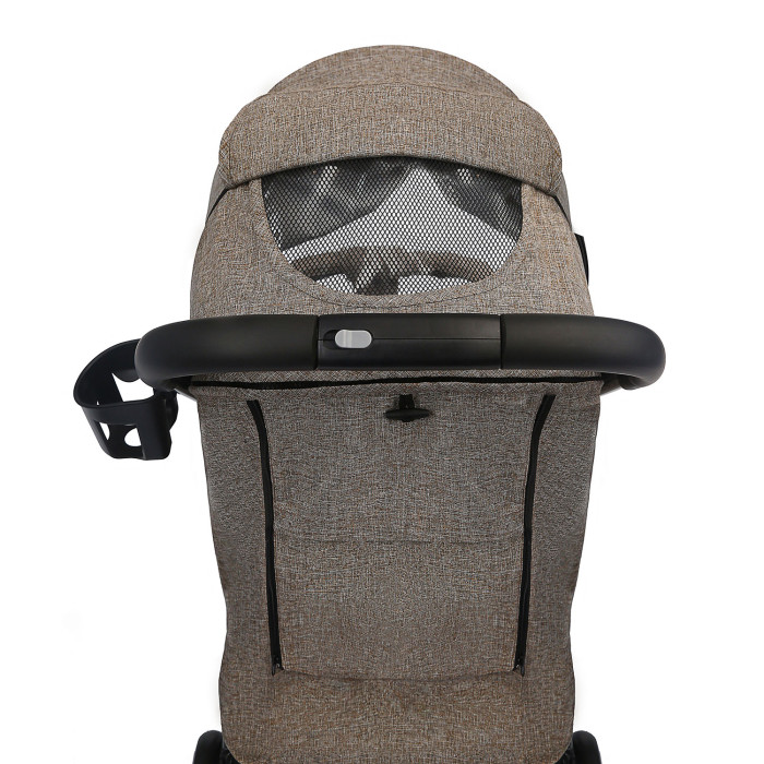 Надежный капюшон ходит бесшумно и регулируется в трех положениях. Увеличение объема происходит за счет солнцезащитного козырька. В капоре есть окошко для вентиляции. Снаружи капюшон и вся коляска покрыты прочной тканью (300 D лен), которая не боится дождя, ультрафиолета, не продувается ветром и при этом легко чистится. Ручка для управления коляской и бампер оснащены практичныи накладками из современной искусственой кожи. В капюшон встроена светоотражающая окантовка.