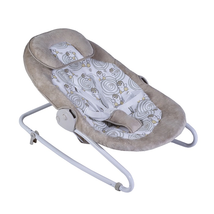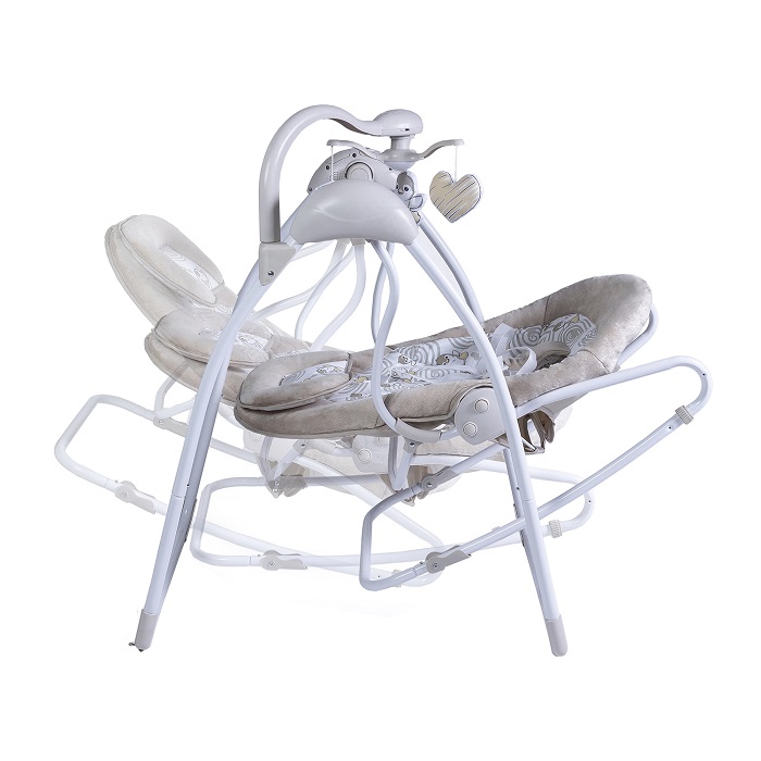 Электрокачели оснащены 5-точечным ремнем безопасности и мягким вкладышем. Устройство работает от 4 батареек АА (LR6) и от сетевого адаптера, который, в отличие от батареек, входит в комплект. Столик съемный. У спинки три положения наклона. Производитель установил пять скоростей укачивания за счет бесшумного маятника.