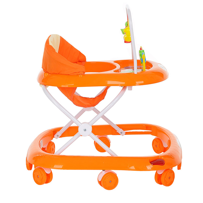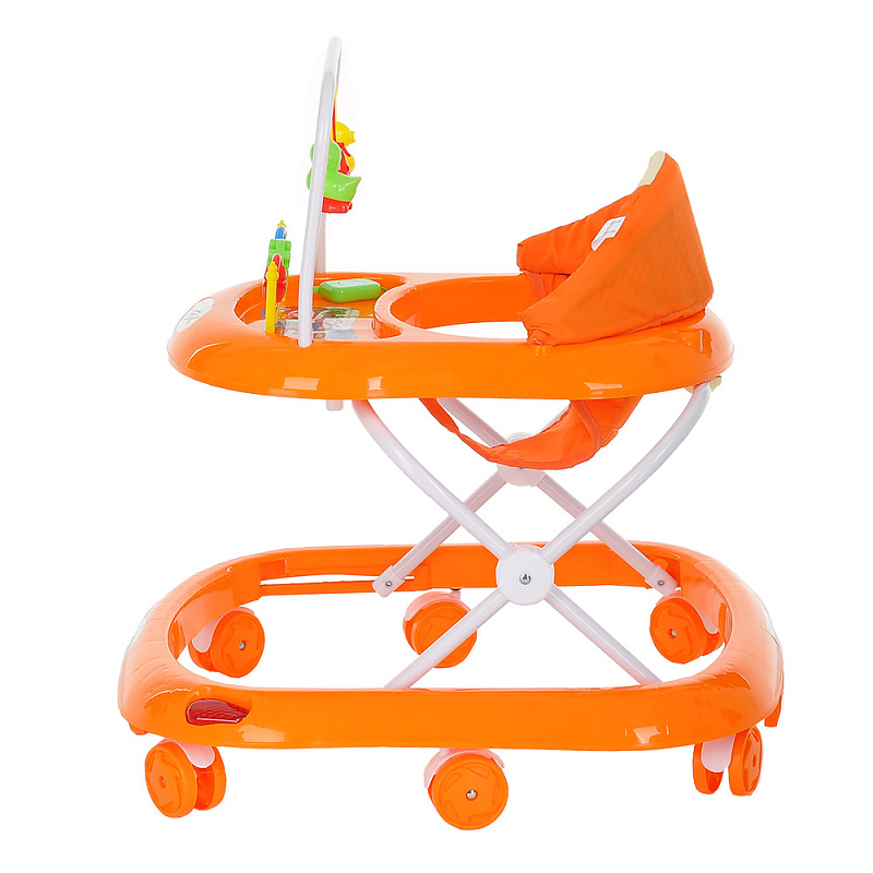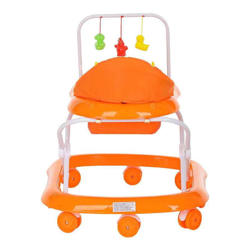 В ходунках широкое основание и 8 пластиковых поворотных колес. Есть тормозная система, позволяющая родителям стопорить устройство, если надо, чтобы ребенок поиграл в одном месте под присмотром. Игровая панель увлекает малыша, яркие погремушки не дают скучать.