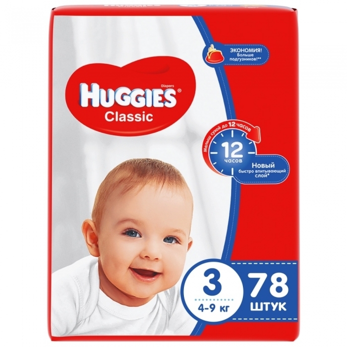 Детские подгузники Huggies Classic 3, 4-9 кг, 78 штук