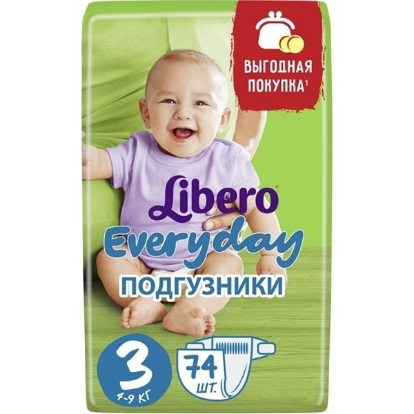 Детские подгузники Libero Everyday с ромашкой 3 Midi, 4-9 кг, 74 штуки