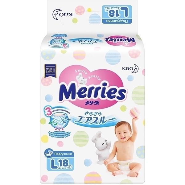 Детские подгузники Merries L, 9-14 кг, 18 штук