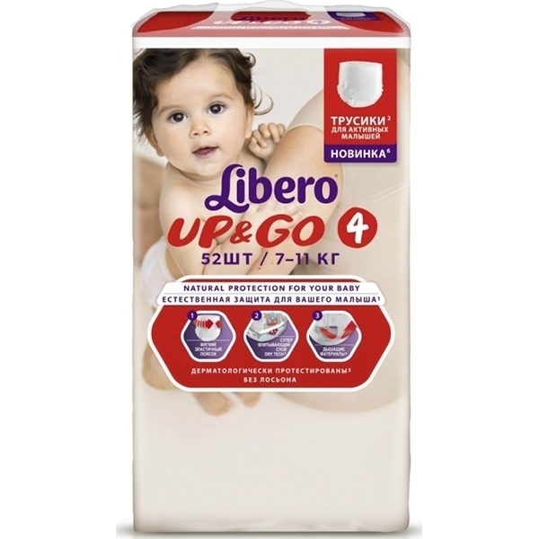 Универсальные детские трусики Libero Up&Go 4 Maxi нравятся родителям по многим причинам. Такой вариант подгузников незаменимы в дороге, легко снимаются и надеваются, обладают нейтральным запахом, подходят для активных, динамичных детей.
