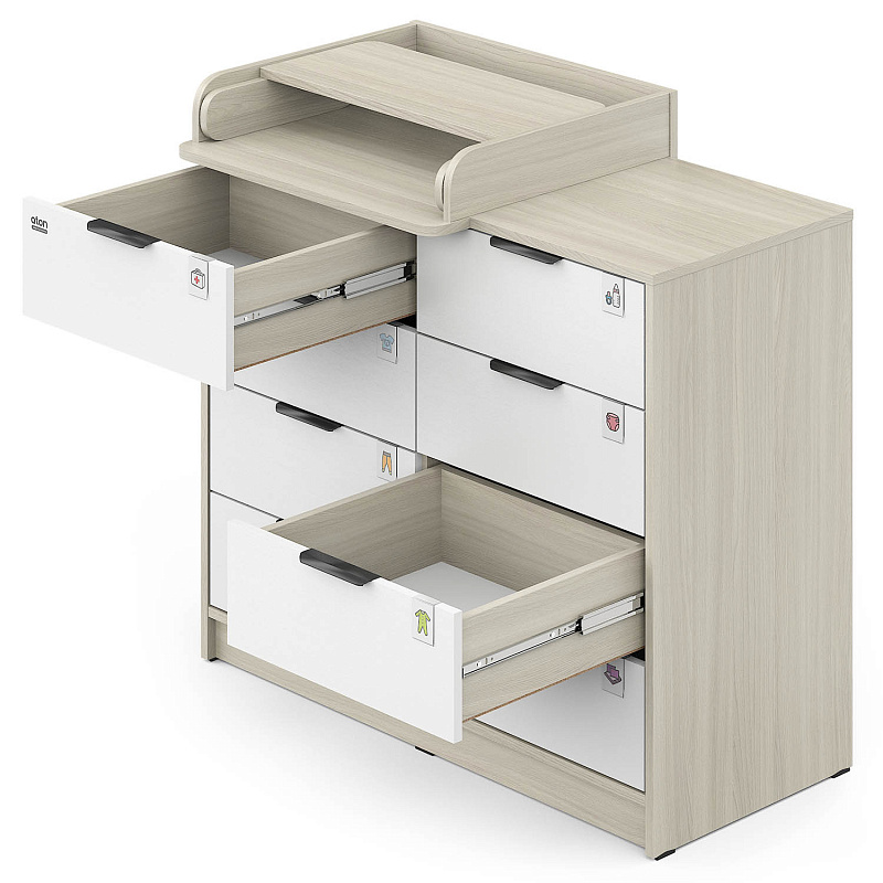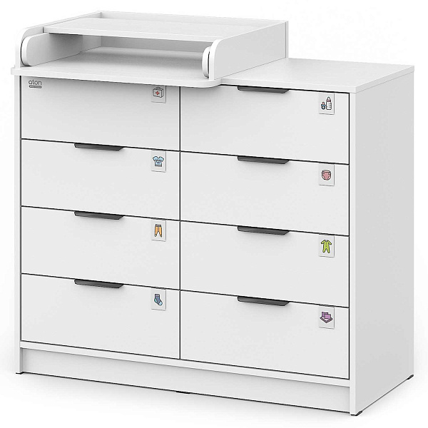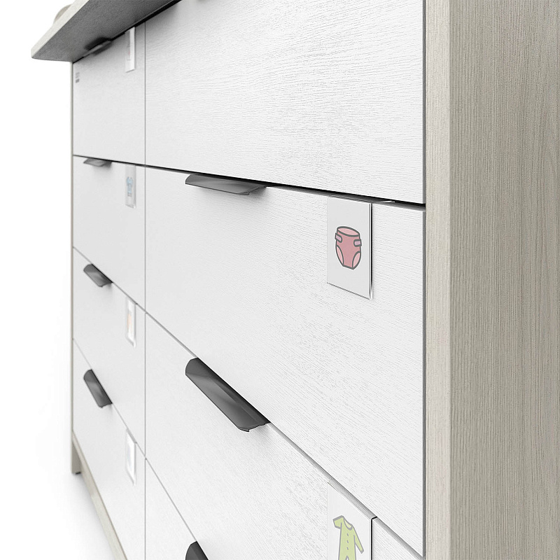 Комод “Зевс” оснащен восемью ящиками и пеленальной доской. Сочетает в себе функциональность и стиль для заботы о ребенке.