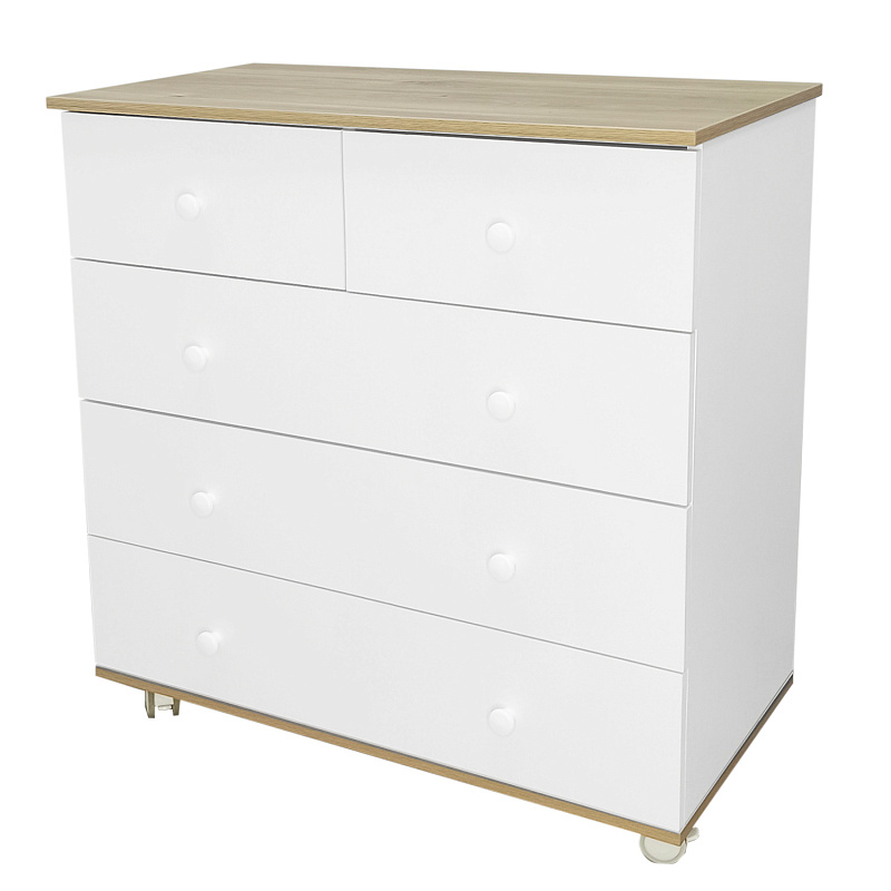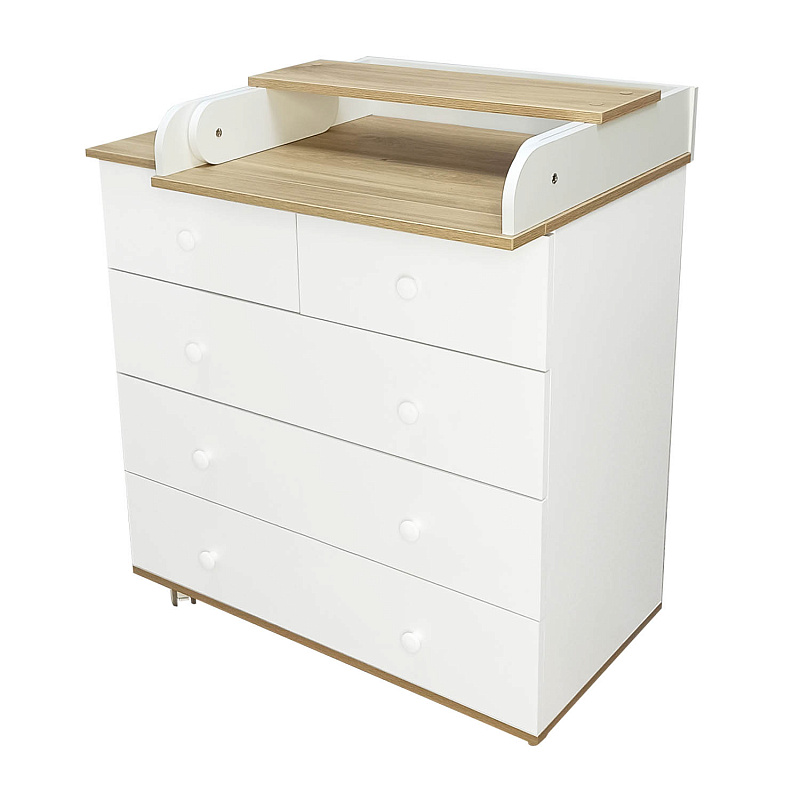 Комод оснащен пятью удобными вместительными ящиками на шариковых направляющих. Когда ребенок подрастет, пеленальный столик превращается в дополнительную полочку для аксессуаров, а комод станет классическим бельевым. Изделие можно передвигать по комнате благодаря прорезиненным колесам.
