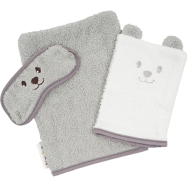 Водные процедуры легко превратить в веселую игру с помощью двух махровых перчаток. Детская рукавичка выполнена в виде игрушки с забавной мордашкой и ушками. Также детский комплект для ванной Tineo включает защиту глаз. Благодаря этому аксессуару шампунь и мыло не попадет в глаза карапуза и не испортит ему настроение.
