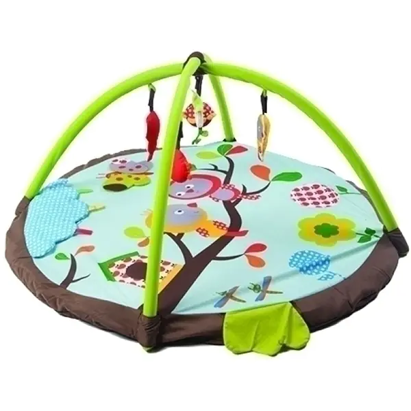 Яркая площадка для игр маленького ангелочка выполнена из мягкого, «дышащего» сатина и украшена оригинальными текстильными аппликациями. Малыш сможет перебирать ручками матерчатые элементы и тянуться к подвесным фигуркам, которые шуршат, звенят и пищат.