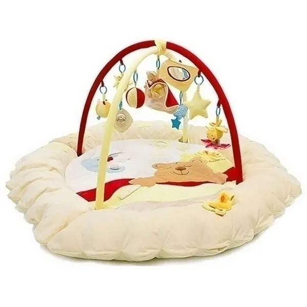 Красочная игровая площадка украшена изображением симпатичного медвежонка, который будет развлекать кроху и знакомить его с новым маленьким миром. По бокам есть мягкие бортики, которые не позволят активному карапузу сползти на пол. Над ребенком установлены съемные дуги с подвесными игрушками, которые издают разнообразные звуки. Когда малютка будет к ним тянуться, чтобы они запищали или зазвенели, у него будет развиваться крупная моторика и хватательный рефлекс.