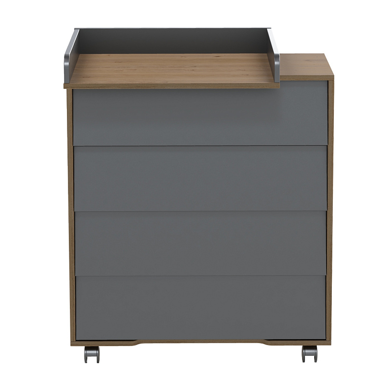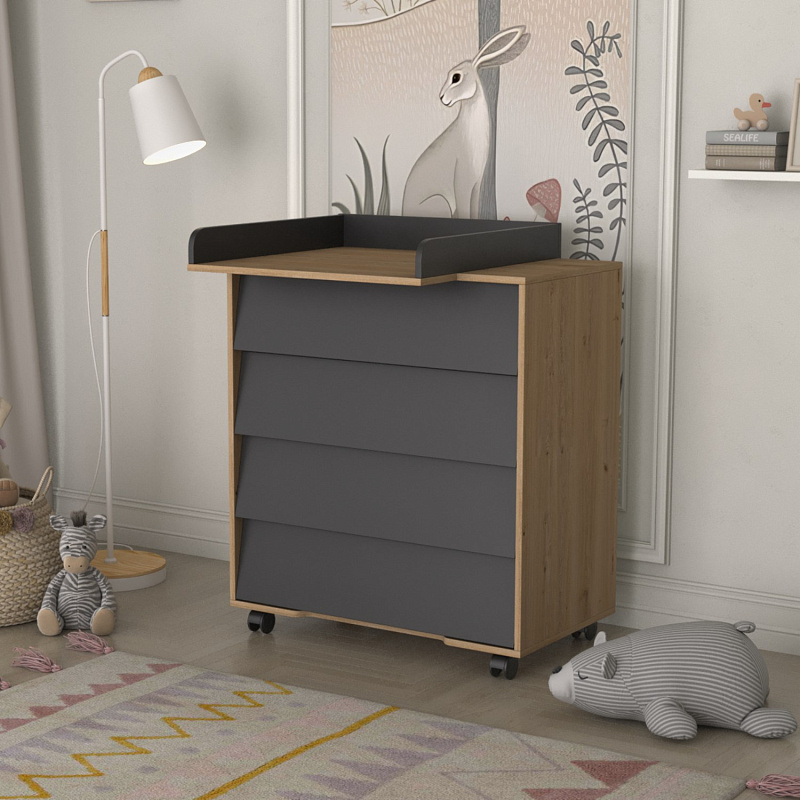 Комод выделяется четырьмя вместительными ящиками с интегрированными ручками, где можно хранить детскую одежду и гигиенические принадлежности. Столик для пеленания раскладывается над верхней крышкой, а будучи сложенным может быть использованным в качестве полки для гигиенических средств. Благодаря боковым бортикам малыш защищен от падения во время массажа или пеленания.