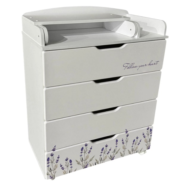 Комод имеет надежную конструкцию: он сделан из ЛДСП и МДФ (фасад). Ящики выдвигаются с помощью шариковых направляющих. Есть целый ряд дизайнерских решений, в том числе с животными и цветами. В комплекте идут удобные колесики.